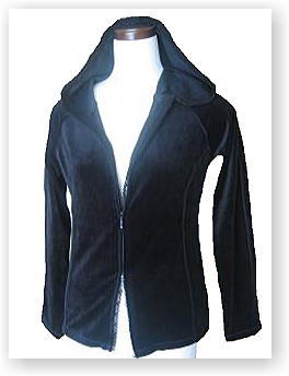 2004年8月 品番:5EZ0370-6 色:黒 価格:\10,400 ベロア素材 合わせからフードの縁の内側に レース付き。Wジッパー ベルベットのような肌触り |