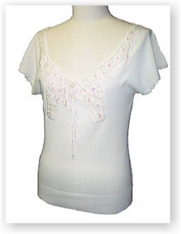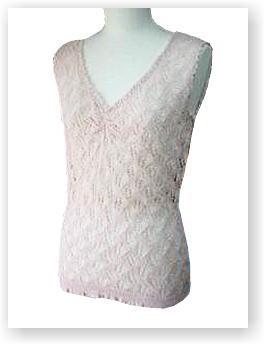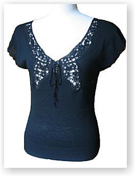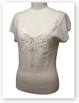 2005年3月 品番:6EK5010-6 色:黒 素材:綿、アクリル 価格:\10,200 サマーニット、フレンチスリーブです。 ホルターネックのが雑誌やカタログに掲載 蝶の部分がかぎ編みになっていて スパンコールとビーズ付です 他に白、ピンク、ブルー・・・ *黒のみ追加生産はないそうです |
