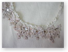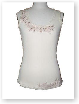 ![]() 2005年8月SALE 品番:6EK0950-2 色:キナリ(2-11) 素材:綿100% 価格:\8,800 ニット品番ですが、 リブ編みのカットソーです お花のスパンコール付きモチーフが 襟ぐりと裾に付いていてとても綺麗です |