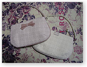 2006 秋フェア ノベルティー ラメツイードポーチ (ピンク・キナリ) 縦11×横18 パールの持ち手は取り外し可能 |