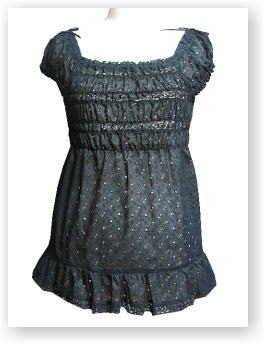 ![]() 2006年4月 品番:2ES0300-3 色:クロ(3-09) 素材:綿100% 価格:\11,000 綿カットワークのカットソーです。 袖はフレンチスリーブです。 胸のところは3段シャーリングしてあります |