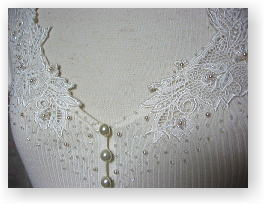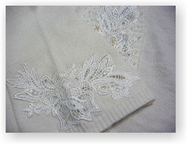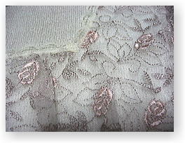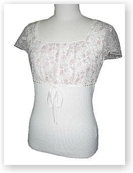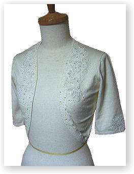 ![]() 2006年7月Sale 品番:2EK0011-1 色:ホワイト(1-10) 素材:アセテート、ナイロン 価格:\13,000 胸とフレンチスリーブの部分の 淡いピンクのバラ刺繍がとても繊細です |